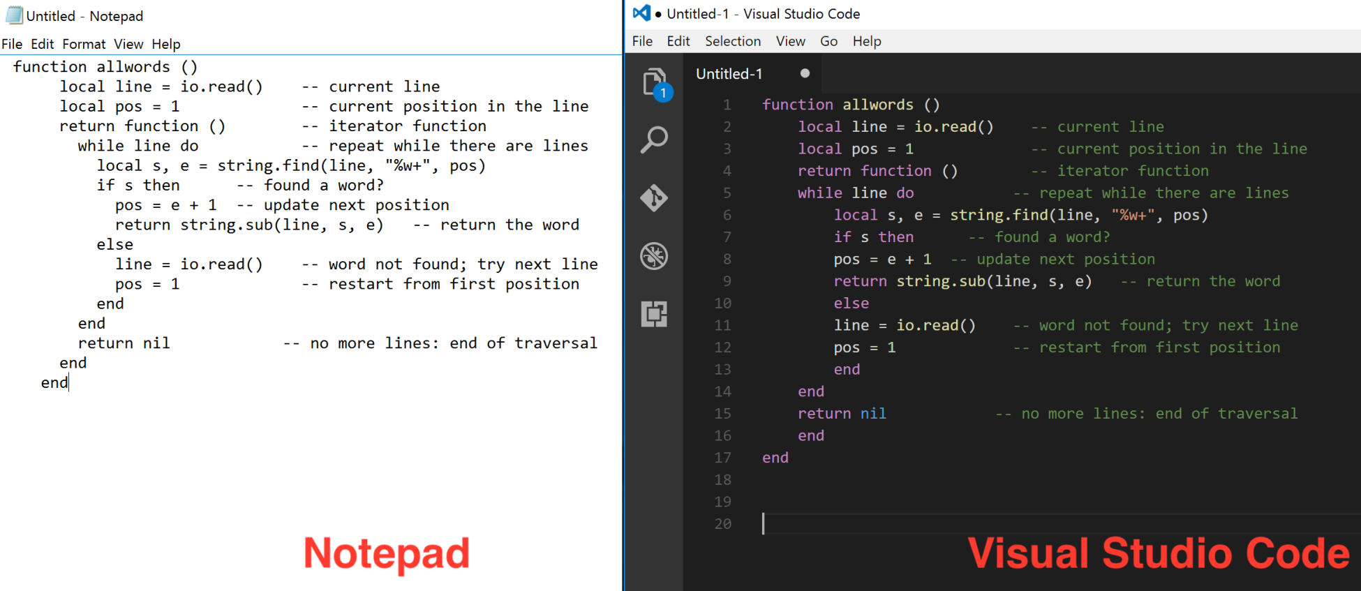 A programming language relies heavily on the tools that support it. Lua files are plain text files. This means you can write Lua in any text editor you want, whether it is emacs, vi, Sublime Text, TextWrangler, or just the OS-provided basic text editor.