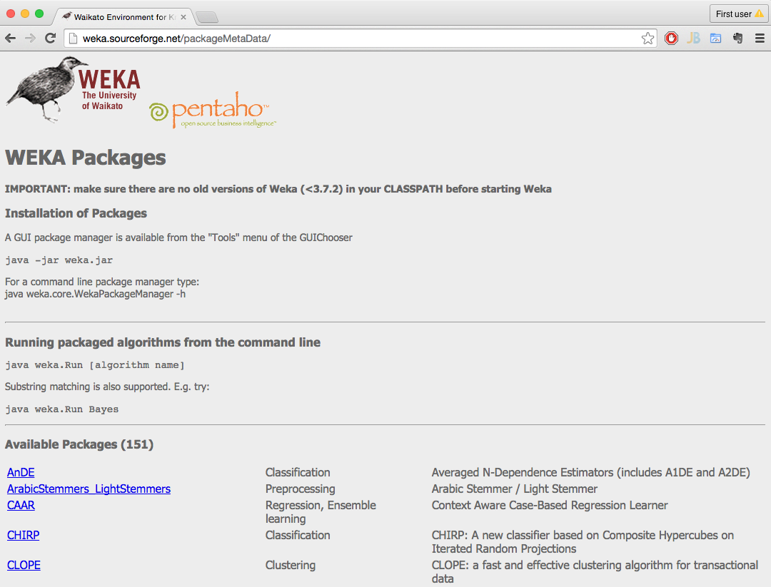 For this task, we will need an additional Weka package, ensembleLibrary. Weka 3.7.2 and higher versions support external packages, mainly developed by the academic community. A list of WEKA Packages is available at http://weka.sourceforge.net/packageMetaData, as shown in the following screenshot: