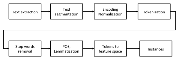 One of the main challenges in text mining is transforming unstructured written natural language into structured attribute-based instances. The process involves many steps, as shown here: