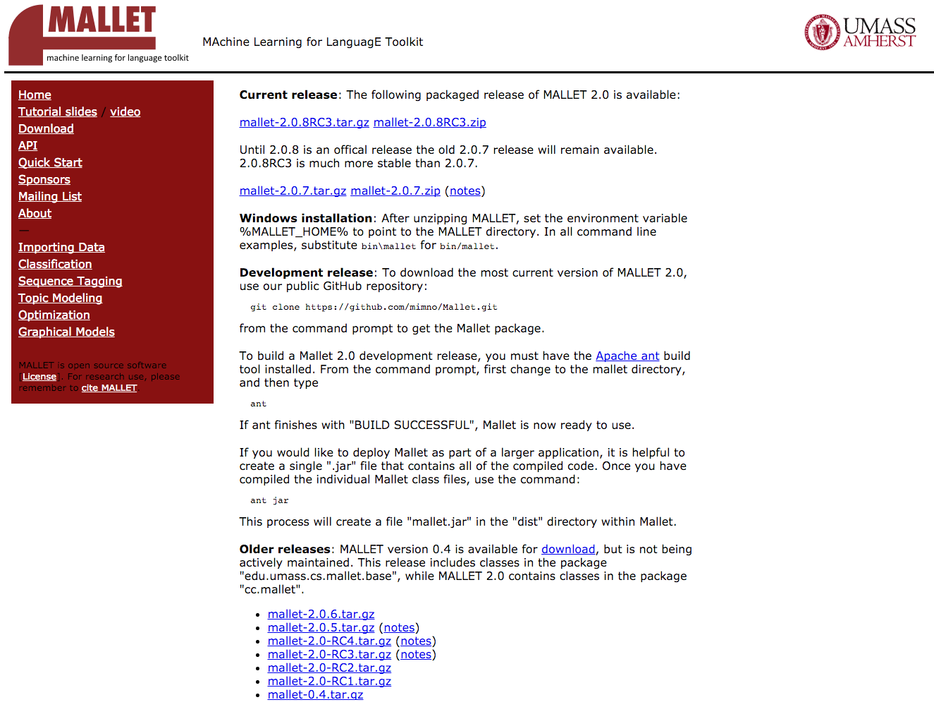 Mallet is available for download at the UMass Amherst University website at http://mallet.cs.umass.edu/download.php. Navigate to the Download section as shown in the following screenshot and select the latest stable release (2.0.8, at the time of writing this book):