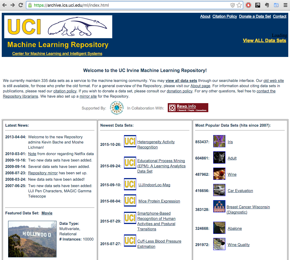 One of the most well-known repositories of machine learning datasets is hosted by the University of California Irvine. The UCI repository contains over 300 datasets covering a wide variety of challenges, including poker, movies, wine quality, activity recognition, stocks, taxi service trajectories, advertisements, and many others. Each dataset is usually equipped with a research paper where the dataset was used, which can give you a hint on how to start and what the prediction baseline is.