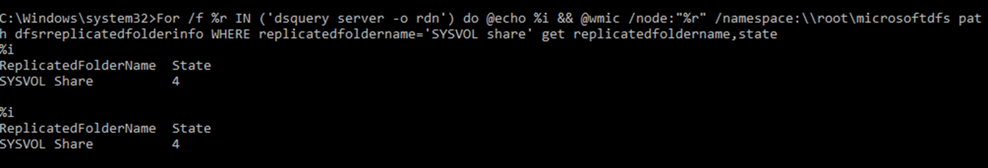 For /f %r IN ('dsquery server -o rdn') do @echo %i && @wmic /node:"%r" /namespace:\\root\microsoftdfs path dfsrreplicatedfolderinfo WHERE replicatedfoldername='SYSVOL share' get replicatedfoldername,state