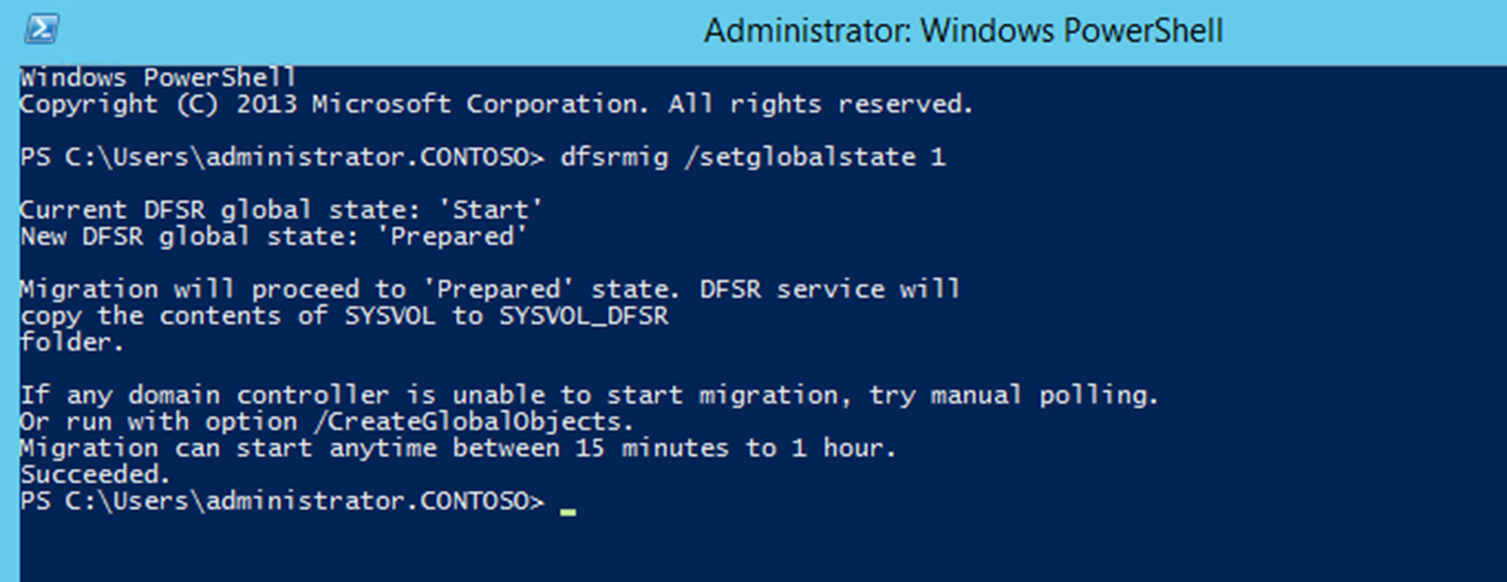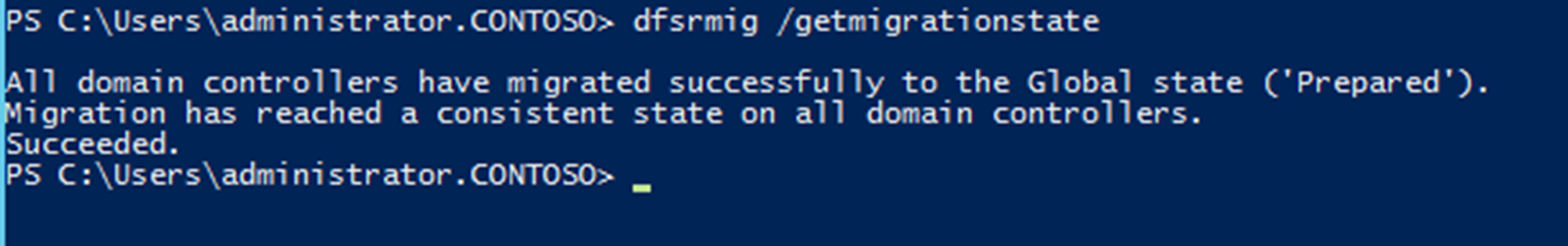 - Type dfsrmig /getmigrationstate to confirm all the domain controllers have reached the Prepared state: