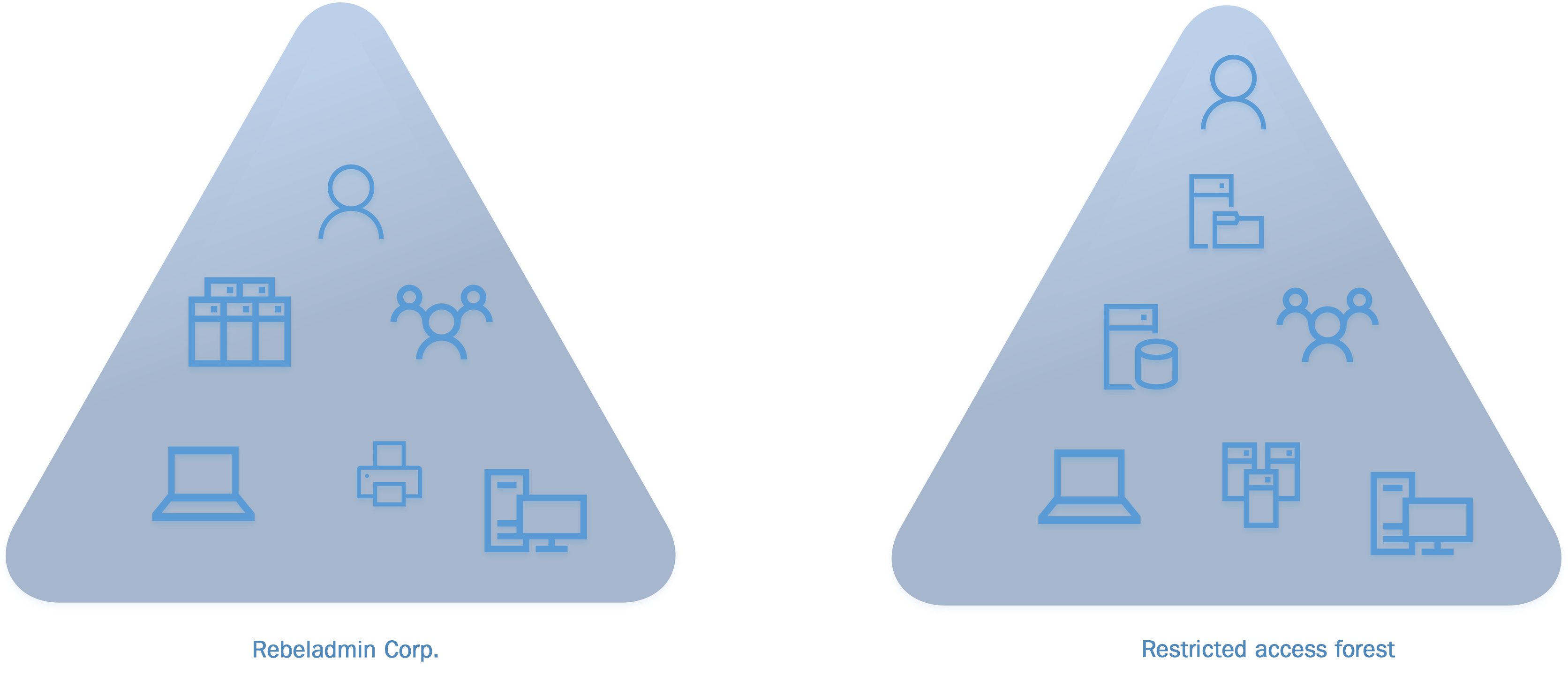 In the restricted access forest model, a separate forest is created to isolate identities, and data must be separated from the other organization's data and identities. There is no trust created between the two forests, so identities in one forest will not be able to access the resources in another. To access the resources in each forest, we need to have separate user accounts. The Restricted access forest model provides data isolation: