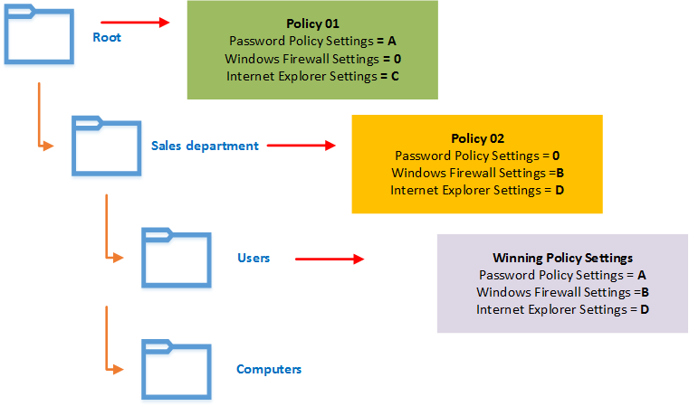 Group policies' precedence order LSDOU and Group Policy inheritance also decide which policy will win when we have some conflicting settings. Let's look at this further with an example: