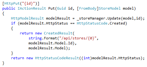We have the ID and model in the signature of the controller class. The route has the ID, and the model is in the body of the request. You will notice that the Post has no ID. We ask the store manager to update our model; if we get back a created one from the store manager, then we publish this location of the new resource. Any other state, including OK, is returned as HttpStatusCodeResult.