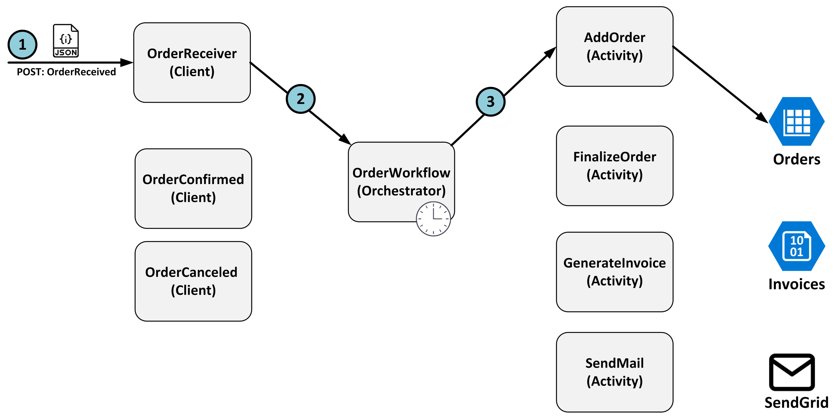 [FunctionName(FunctionNames.OrderReceiverFunction)]public static async Task<HttpResponseMessage> Run([HttpTrigger(AuthorizationLevel.Function, "post")] HttpRequestMessage req, [OrchestrationClient] DurableOrchestrationClient starter, ILogger log){ string instanceId = null; var orderDto = await ReadOrderFromRequestAsync(req); if (orderDto != null && orderDto.IsValid()) { var order = orderDto.ToOrder(); instanceId = await starter.StartNewAsync(FunctionNames.OrderWorkflowFunction, order.Id, ...