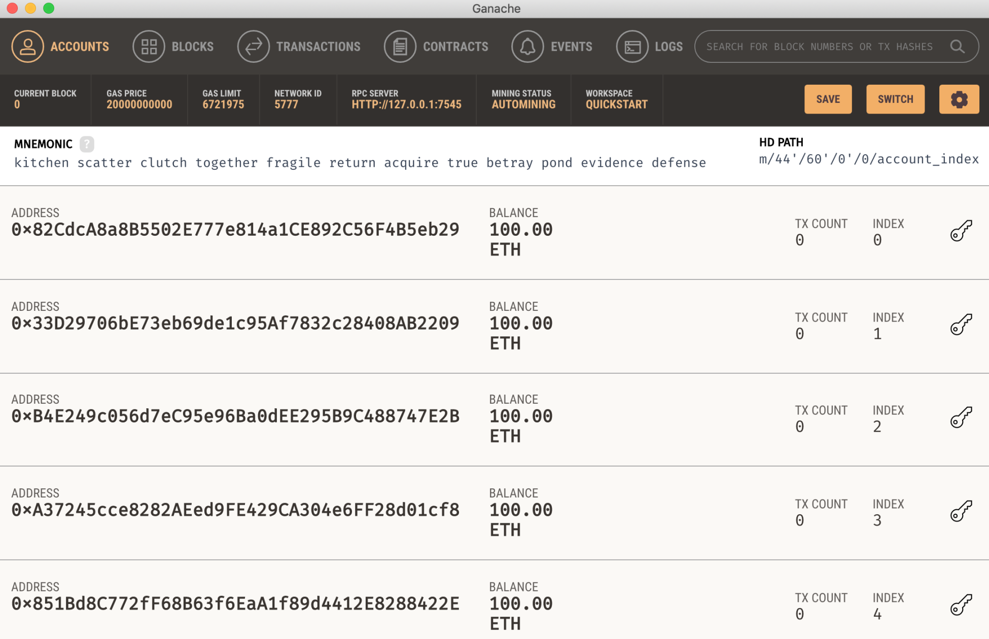 As mentioned earlier, you can start a local Ganache blockchain instance by just clicking on the QUICKSTART button. This starts the blockchain with a configured mnemonic phrase and initializes accounts by default with 100.00 ETH each, as shown in the following screenshot. By default, it opens the Accounts view: