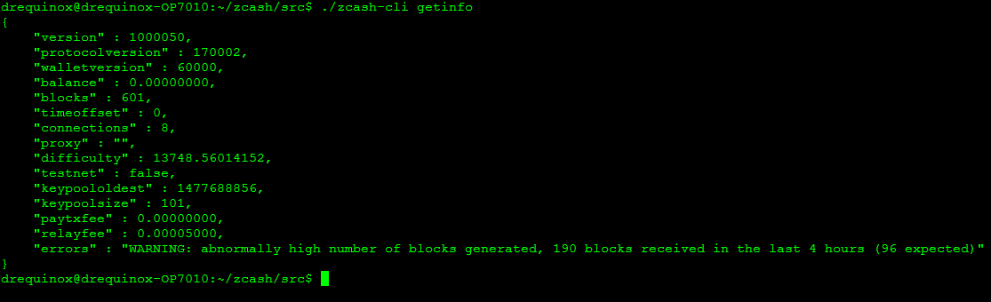 Running the zcash-cli command with the getinfo parameter produces the output shown in the following screenshot. It displays valuable information such as blocks, difficulty, and balance: