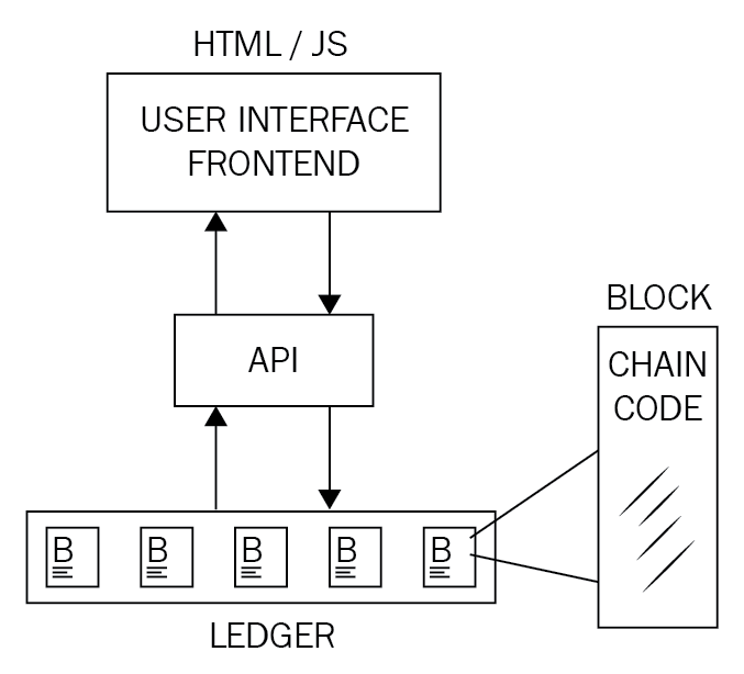 A typical application on Fabric is simply composed of a user interface, usually written in JavaScript/HTML, that interacts with the backend chaincode (smart contract) stored on the ledger via an API layer: