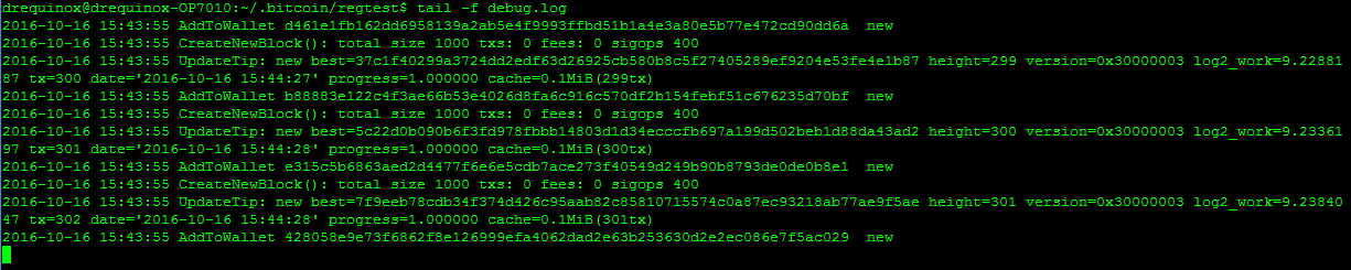 Relevant log messages can be viewed in the .bitcoin/regtest directory on a Linux system under debug.log: