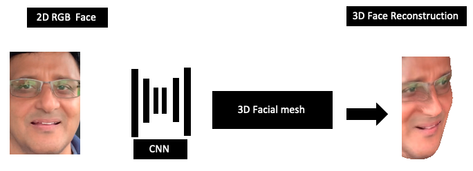 The 3D face reconstruction involves estimating the coordinates of the 3D face from the corresponding 2D image by regressing the depth by constructing a CNN. The following image illustrates this graphically: