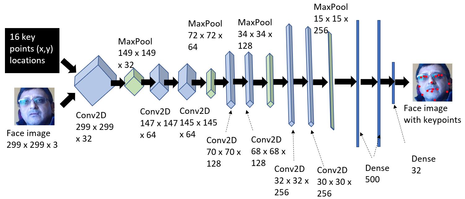 The model involves using a convolutional neural network (CNN) to process the facial image along with its 16 key-points. For details on CNNs, please refer to Chapter 4, Deep Learning on Images. The input to the CNN is train and test images, along with their key-points, and its output will be key-points corresponding to a new image. The CNN will learn to predict the key-points. Details of the model architecture are shown in the following image: