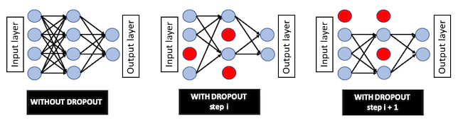 Dropout is a special type of regularization and refers to ignoring neurons in the neural network. A fully connected layer with dropout = 0.2 means that only 80% of the fully connected neurons are connected to the next layer. The neurons are dropped at the current step but are active at the next step. Dropout prevents the network from being dependent on a small number of neurons, thus preventing overfitting. Dropout is applied to input neurons, but not the output neurons. The following diagram shows the neural network with and without dropout: