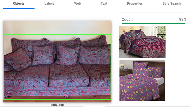 GCP has a vision API to perform cloud-based image information, including facial detection and image content analysis. For more details, visit https://cloud.google.com/vision. See the example results that were uploaded for a sofa in the following screenshot; detection was carried out along with several examples of visually similar images: