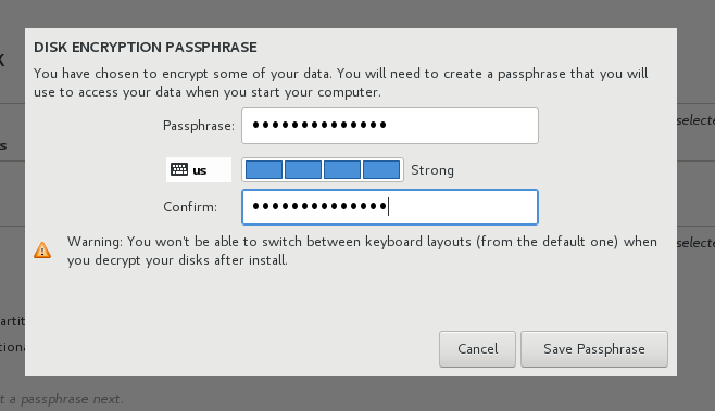 Before the installation can continue, I have to create a passphrase to mount the encrypted disk: