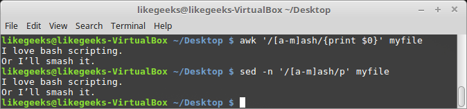 $ awk '/[a-m]ash/{print $0}' myfile$ sed -n '/[a-m]ash/p' myfile