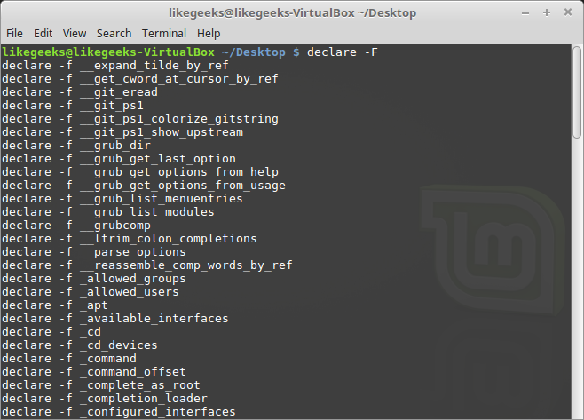The output will vary depending on the distribution you are using and the number of functions you have created. On my Linux Mint, the partial output is shown in the following screenshot: