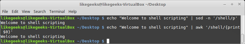 $ echo "Welcome to shell scripting" | sed -n '/shell/p'$ echo "Welcome to shell scripting" | awk '/shell/{print $0}'