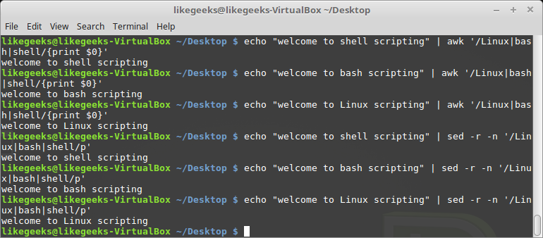 $ echo "welcome to shell scripting" | awk '/Linux|bash|shell/{print $0}'$ echo "welcome to bash scripting" | awk '/Linux|bash|shell/{print $0}'$ echo "welcome to Linux scripting" | awk '/Linux|bash|shell/{print $0}'$ echo "welcome to shell scripting" | sed -r -n '/Linux|bash|shell/p'$ echo "welcome to bash scripting" | sed -r -n '/Linux|bash|shell/p'$ echo "welcome to Linux scripting" | sed -r -n '/Linux|bash|shell/p'