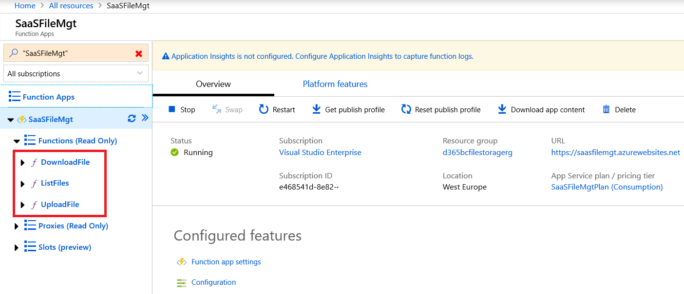 If you go to the Azure portal, you will see that the functions have been published and that you now have a public URL to test them: