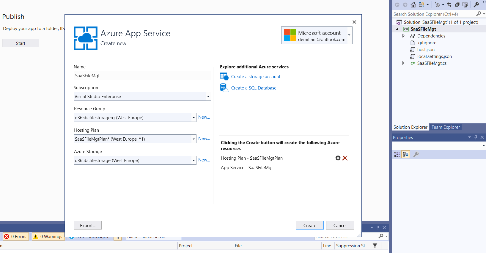 Our Azure functions can be deployed to our Azure subscription directly from Visual Studio. To deploy these functions to Azure, you need to create a new Azure App Service instance, as follows: