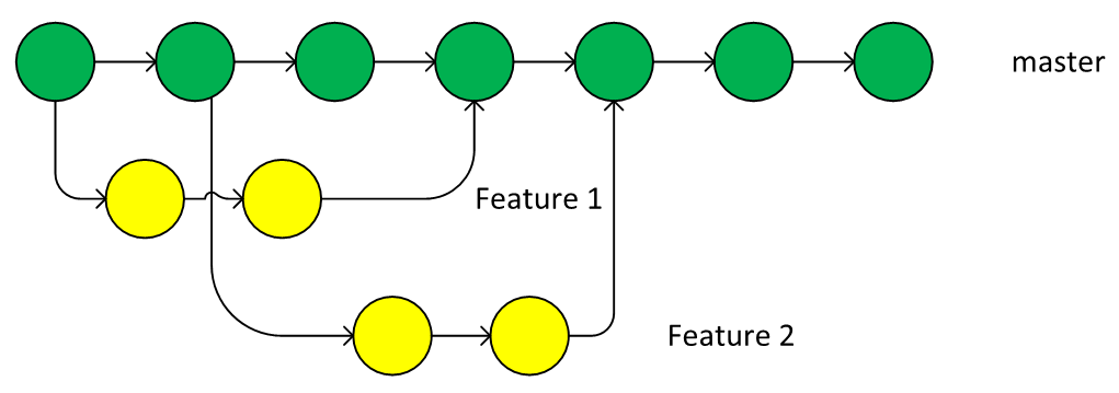 After the feature is finished and integrated back to the master branch, the feature branch can be deleted. If the branch is per developer, you can expect that the branch will live a long time. This could be a problem from a long-term point of view. The following diagram depicts this: