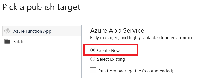 - We need to choose an Azure App Service to deploy the function to. To do this, we can select an existing one or create a new one. Here, I have created a new Azure App Service instance for this function: