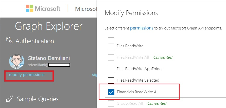 To work with Dynamics 365 Business Central in Graph, you first need to change your Dynamics 365 Business Central user's permission in Graph and then enable the Financials.ReadWrite.All permission scope. You can do that by using the Graph Explorer tool: