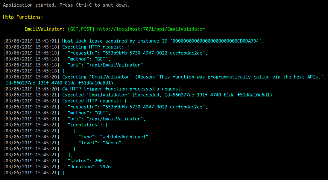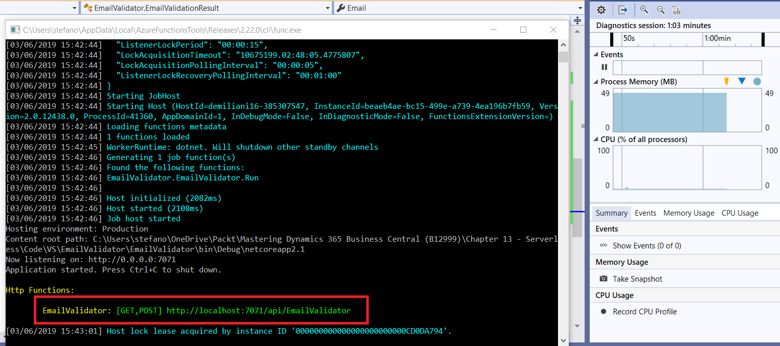 We can test our function by opening a browser and calling a URL, such as http://localhost:7071/api/EmailValidator?email=masteringd365bc@packt.com.