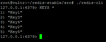 Using the KEYS * command within the redis-cli shell, we are able to now list all the entries added by Redis: