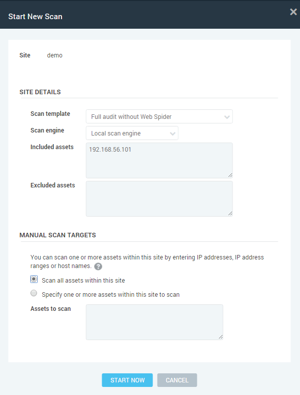 Nexpose allows you to analyze a specific IP, domain name, or server. First of all, it is necessary to create a set of resources, known as assets, which define all the elements auditable by the engine.