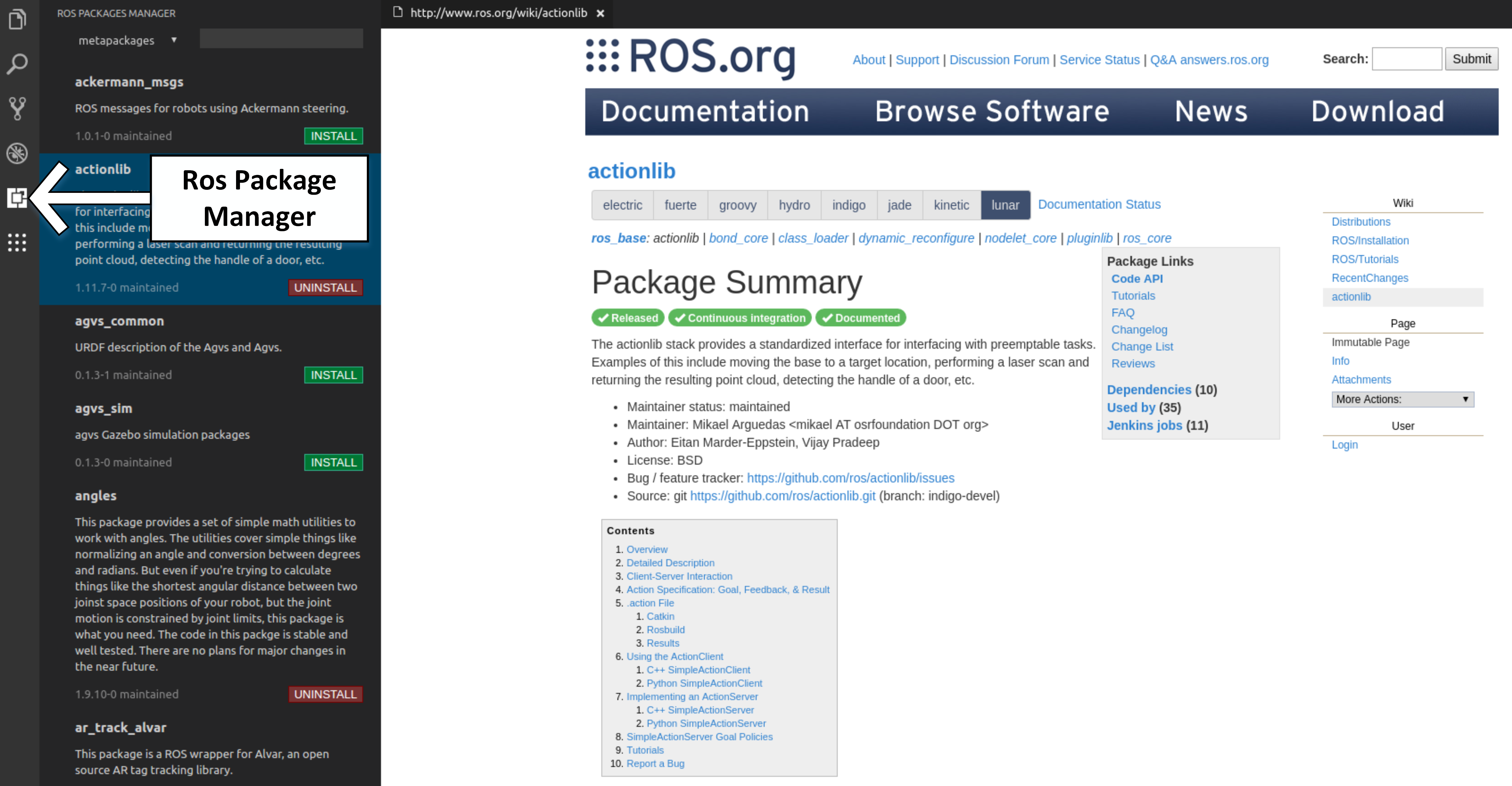 From this panel, we can navigate through the packages available in the ROS repository, choosing between packages and meta-packages. You can click the package name to view its wiki page directly in RoboWare Studio, and install or uninstall the desired package: