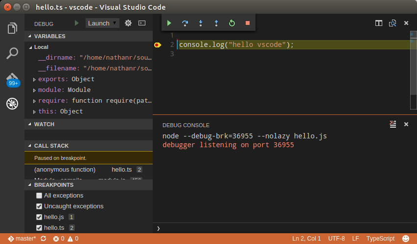 Using breakpoints and debugging at this stage will only work on the generated .js JavaScript files. We will need to make a change to the tsconfig.json file to enable debugging directly in our TypeScript files. Edit the tsconfig.json file, and add a property with the name sourceMaps and the property value true. This instructs the compiler to output a source map file (named .map) for each TypeScript file we are compiling. Once we rebuild the project, these map files will appear in our source code tree. Now, we can set breakpoints directly in our .ts files for use by the VSCode debugger: