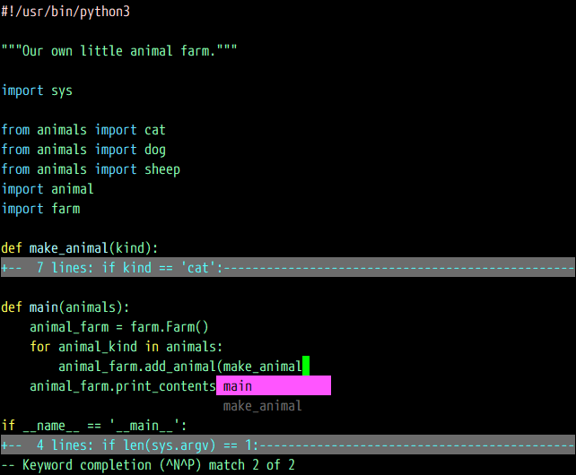Vim supports native autocomplete based on words available in open buffers. It's available out of the box starting with Vim 7.0. Start by typing the beginning of a function name and hit Ctrl + n to bring up the autocomplete list. You can navigate the list using Ctrl + n and Ctrl + p. For example, open animal_farm.py, enter insert mode, and start typing the first two letters of a function name: ma (make_animal). Press Ctrl + n. This will bring up a list of available options: