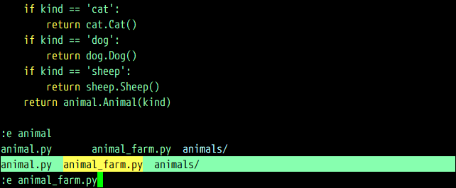 Another way to explore file trees is to use the set wildmenu option in your .vimrc file. This option sets an autocomplete menu to operate in enhanced mode, showing possible autocomplete options above the status line. With wildmenu enabled, type in :e (followed by a space) and hit Tab. This will bring up a list of files in the current directory, and you can use the Tab key to iterate through these and Shift + Tab to move backward (the left and right arrow keys perform the same function):