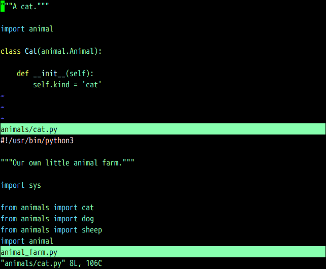 Let's give working with windows a shot. Open animal_farm.py (either from a command line by running $ vim animal_farm.py or from Vim with :e animal_farm.py).
