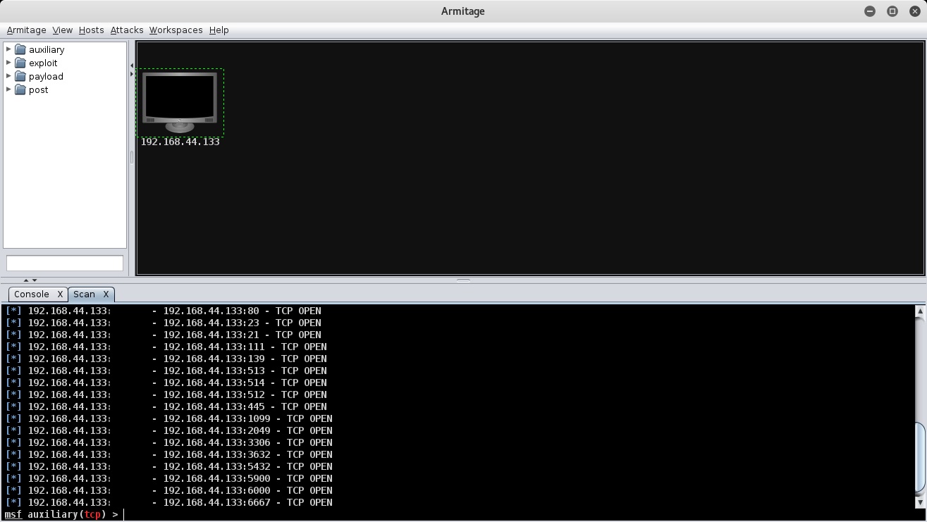 Now that we have added a target host to the Armitage console, we'll perform a quick port scan to see which ports are open here. To perform a port scan, right-click on the host and select the scan ;option, as shown in the following screenshot. This will list down all the open ports on the target system in the bottom pane of the Armitage console: