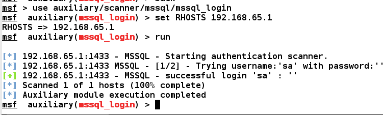 As soon as we run this module, it tests for the default credentials at the very first step, that is, with the username sa and password as blank, and found that the login was successful. Therefore, we can conclude that default credentials are still being used. Additionally, we must try testing for more credentials if in case ...