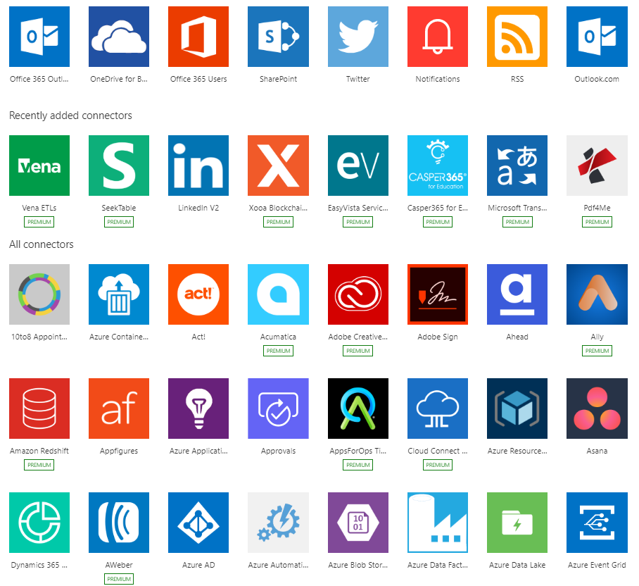 Power Automate (formerly Microsoft Flow) has been launched as Microsoft's lightweight workflow engine for end-users, developers, and IT professionals. It lets you build personal automated workflows using a wide range of services, without having to learn any code. There are hundreds of templates available to build flows that talk to Dropbox, Twitter, Yammer, Facebook, Dynamics, and other services. This makes building flows quicker and easier. There are over 300 services available as of today. Some are shown in the following: