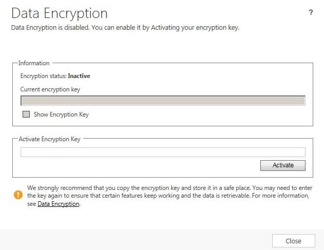 - In the Data Encryption dialog, enter an encryption key under Activate Encryption Key and click on Activate as the following screenshot shows: