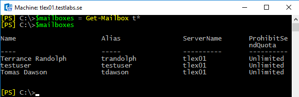 First, we retrieve a list of mailboxes that start with the letter t and assign that to the $mailboxes variable. From looking at the items in the $mailboxes object, we can see that the testuser mailbox is ...