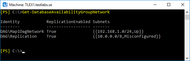 In the preceding screenshot, you can see that DAG\Replication is listed as Misconfigured. In this case, this was a manually added DAG network that is no longer in use by any of the servers in the DAG. Use the Remove-DatabaseAvailabilityGroupNetwork cmdlet to delete the ...