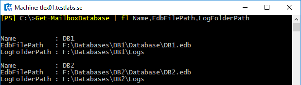 Here you can see that we are piping the Get-MailboxDatabase cmdlet to Format-List (using the fl alias) and selecting the Name, EdbFilePath, and LogFolderPath properties, which will display the relevant information for every database in the organization. You can retrieve this information for a single database by specifying the name of the database using the -Identity parameter.