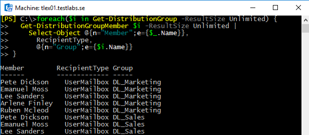This code loops through each item returned from the Get-DistributionGroup cmdlet. As we process each group, we run the Get-DistributionGroupMember cmdlet to determine the member list for each group and then use Select-Object to construct a custom object that provides Member, RecipientType, and Group properties. Notice that, when running both Exchange cmdlets, we're setting the -ResultSize parameter to Unlimited to ensure that the details will be retrieved in the event that there are more than 1,000 groups or group members. The result of the preceding cmdlets will look similar to the following screenshot: