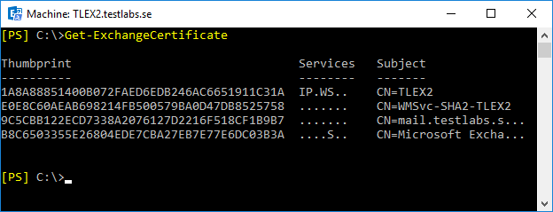 You can see that there are several certificates installed. When assigning services to a certificate, we need to be specific about which one needs to be modified. We can do this either by specifying the thumbprint of the certificate when running the Enable-ExchangeCertificate cmdlet, or using the method shown previously, where we used the Get-ExchangeCertificate cmdlet with the -DomainName ...