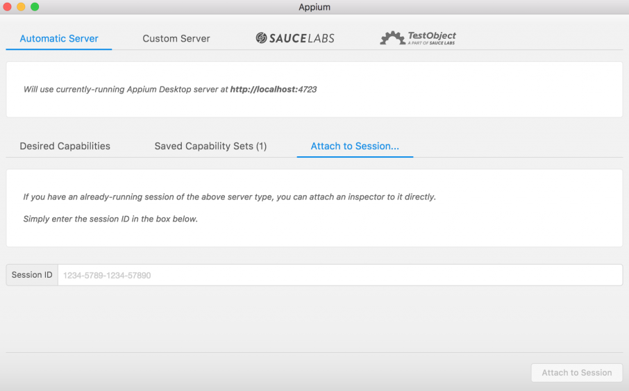 It allows you to attach to an existing session by providing just the session-id (as shown in the following screenshot). This comes in handy when you already have an Appium session, and you are in the middle of a running test. Attaching to an existing Appium session is possible because the inspector is just an Appium client:
