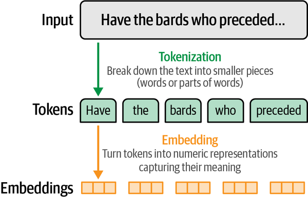Figure 2-1. Les modèles de langage traitent le texte en petits morceaux appelés tokens. Pour que le modèle de langage puisse calculer la langue, il doit transformer les tokens en représentations numériques appelées embeddings.