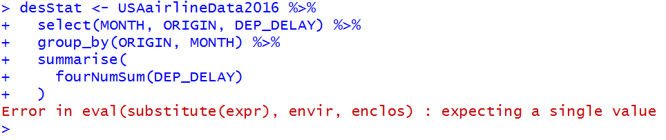 You might think that we could use the newly defined function within the dplyr framework just like the other function inside the summarize() function, but there is a problem in using the multi-valued function within summarize(). Here is an example of the use of the customized multi-valued function within the summarize() function: