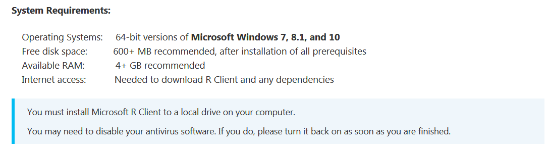 - Install Microsoft R Open or CRAN R 64-bit with R version 3.2.1 or higher.